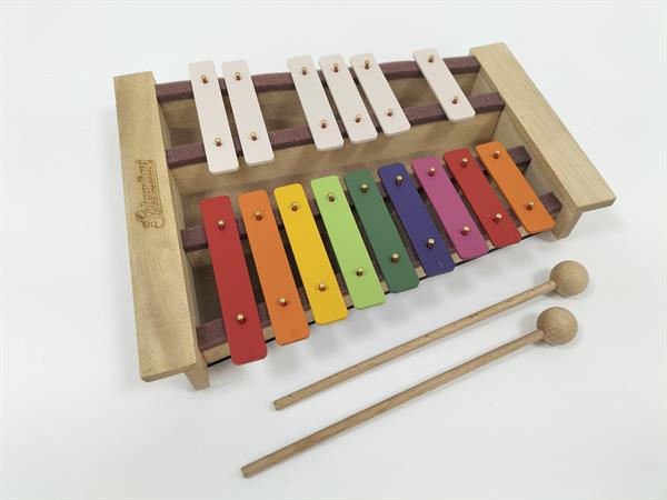 Für dieses Modell haben wir einen ästhetischen Stil mit Aluminiumplatten und einem hölzernen Resonanzkörper gewählt, der für Kinder äußerst attraktiv ist. Mit diesem chromatischen Glockenspiel, bestehend aus 15 Tönen, lassen sich Melodien auch in verschiedenen Tonarten spielen. Nicht nur Geschichtenerzähler und Musiktherapeuten, auch viele Schüler mit Vorkenntnissen verwenden dieses Metallophon in ihrem Musikunterricht.