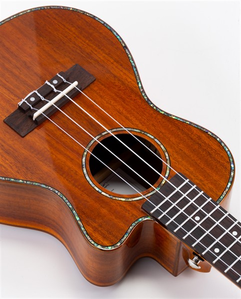 Diese sehr hochwertige hochglanzlackierte Koa-Ukulele ist mit einem Cutaway ausgestattet. Das edle Walnuss-Korpus-Bindung in Kombination mit der Schalloch- und Korpus-Perlmutt-Einlage ist ein echter Hingucker. Die durchbrochene Kopfplatte ist nicht nur sehr schön, sondern garantiert einen sehr ausgewogenen Grundsound. Die gute Saitenlage, stimmstabile Mechaniken und eine sauber Intonation machen das Spiel zum Vergnügen. Besaitet mit hochwertigen Aguila-Saiten.