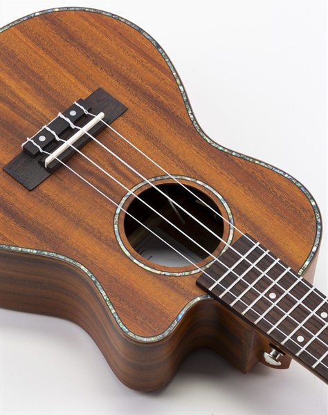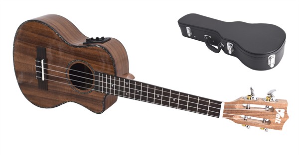 Diese offenporig lackierte Koa-Ukulele ist mit einem Cutaway ausgestattet. Das edle Walnuss-Korpus-Bindung in Kombination mit der Schalloch- und Korpus-Perlmutt-Einlage ist ein echter Hingucker. Die durchbrochene Kopfplatte ist nicht nur sehr schön, sondern garantiert einen sehr ausgewogenen Grundsound. Die gute Saitenlage, stimmstabile Mechaniken und eine sauber Intonation machen das Spiel zum Vergnügen. Besaitet mit hochwertigen Aguila-Saiten. Für die Bühne ist diese Ukulele dank des integrierten aktiven Tonabnehmers mit 3-Band-EQ und Stimmgerät mit beleuchtetem Mini-Display bestens geeignet.