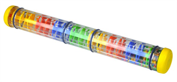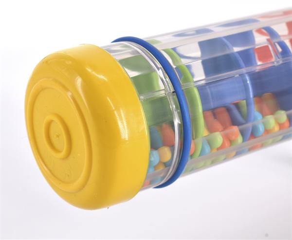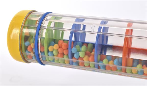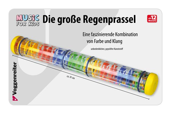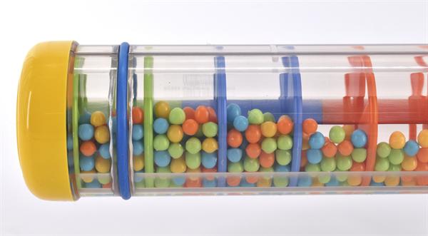 Ein bunter Regenbogen rieselnder Kügelchen erzeugt beim Drehen oder Schütteln der großen Regenprassel eine faszinierende Kombination von Farbe und Klang, die alle Sinne erfasst – und das Beste: niemand wird nass!