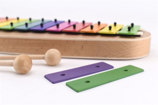 Dank des großen Tonumfangs (c3-f4) können auch Melodien mit größerem Tonumfang gespielt werden und durch den einfachen Wechsel einer Klangplatte ist das Glockenspiel auch in G-Dur oder F-Dur spielbar.