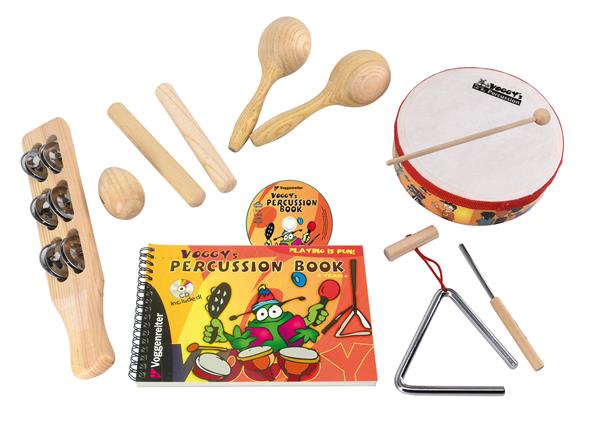 Damit es nicht nur beim „Krachmachen“ mit den kindgerechten und qualitativ hochwertigen Rhythmus-Instrumenten aus Holz bleibt, gibt das farbige Buch „Voggy’s Kinder-Percussion-1x1“ sinnvolle Anregungen, den Takt von Voggy’s lustigen Rasselbanden-Songs nachzuempfinden. Die enthaltene Mitmach-CD (auch als Download) zum Anhören, Mitsingen und Mitspielen rundet das Paket akustisch ab und macht den ersten Kontakt mit der Musik zu einem fröhlichen Erlebnis für alle Sinne!